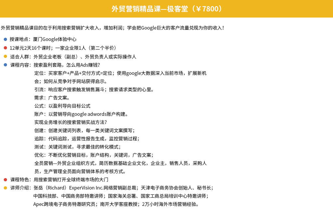 總經(jīng)理--程昆鵬:外貿(mào)黃埔軍校的課程主要是量化和落地的方法比較多,任何工作,都可以做到量化、標(biāo)準(zhǔn)化及制度化,使企業(yè)在崗員工的崗位職責(zé)功能發(fā)揮到最大,可以幫助企業(yè)在制度建立、崗位職責(zé)細(xì)分方面,做出非常多的落地工作。